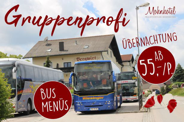Als Reisegruppe sind Sie bei uns bestens aufgehoben! Freuen Sie sich auf die persönliche, herzliche Betreuung der Bergwirtinnen Eva & Maria Schrammel, die seit über 50 Jahren Reisegruppen und Busgesellschaften im „Bergwirt & Mohnhotel“ willkommen heißen. Dank unserer Erfahrung können wir auf Wunsch auch große Gruppen innerhalb einer Stunde kulinarisch verwöhnen – so bleibt Ihr Zeitplan entspannt und flexibel. Alle interessanten Ausflugsziele im Waldviertel erreichen Sie von uns aus in maximal 30 Minuten.
